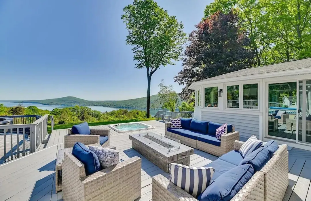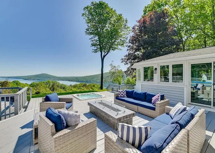 Situated around a 10-minute drive from the Ontario County Park at Gannett Hill, the 5-bedroom Hot Tub While Taking In Lake Front View Naples villa entices guests with a Jacuzzi, ensuring a more relaxing stay.